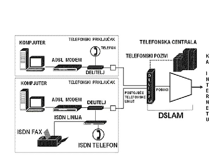 Uređaji za povezivanje • modem - uređaj koji pretvara računalne podatke iz njihova digitalnoga oblika u analogni oblik (ton) kojim putuju telefonskim vodom • ISDN (Integrated Services Digital Network) tehnologija je koja se koristi digitalnom telefonskom linijom • DSL (Digital Subscriber Line) tehnologija je koja se koristi brzom telefonskom linijom za brzi prijenos podataka • bežični modem • ADSL je tehnologija za prijenos digitalnih podataka velikom brzinom preko postojeće telefonske linije. • ADSL (Asymmetric Digital Subscriber Line-asimetrična digitalna pretplatnička linija) - brzina primanja podataka (download) nekoliko puta veća od brzine slanja podataka (upload)