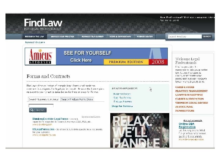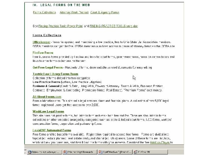 Outline l Internet v. Lexis, Westlaw l Forms l Evaluating Web Sites l Legal Portals and Search Engines l Free Case Law/Primary Sources l Current Awareness l Internet Documents in Court