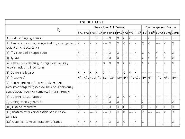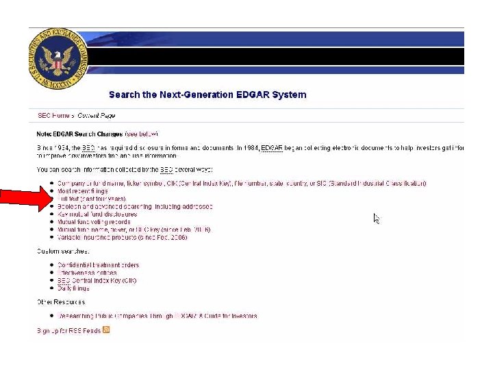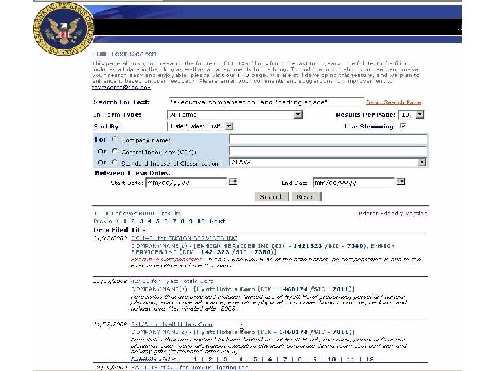 SEC Edgar Full Text Search Features l Fields for company name, SIC code, date, form type (but not exhibit type) l Natural language or Boolean l Phrase (“”), AND, OR, NOT, truncation (*, communicat* ), proximity operator (general NEAR 1 motors ) l Past 4 years