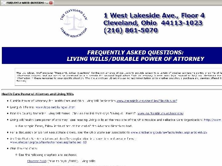 Transactional Forms – Other Ideas l Search engines – general or legal l Court dockets l Cleveland Law Library FAQs – ex. Living Wills Durable Power of Attorney