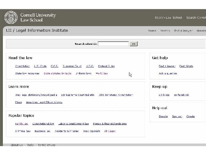 Internet Portals l Library Home Page – Legal Research on the Web l Public Records & People Finders l Cornell Legal Information Institute (LII) l Find. Law l Other Portals