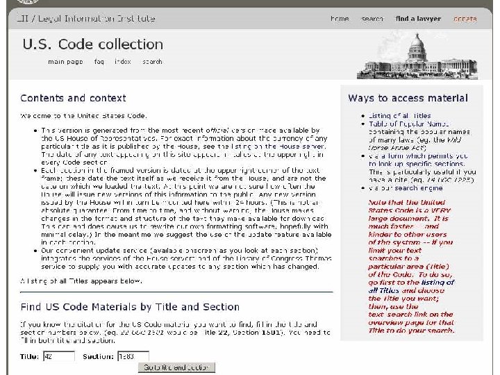 What’s on the Free Web l All US Supreme Court Cases l Reported Federal Appellate 1882 -, Fed District 1932 l Some Unreported Fed App, Fed District l State cases: Reported cases from 1950 -, unreported varies (1990 s on) l Statutes & Regulations- federal and states l LOTS more!