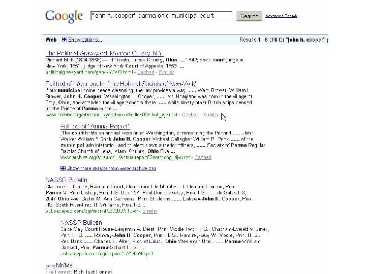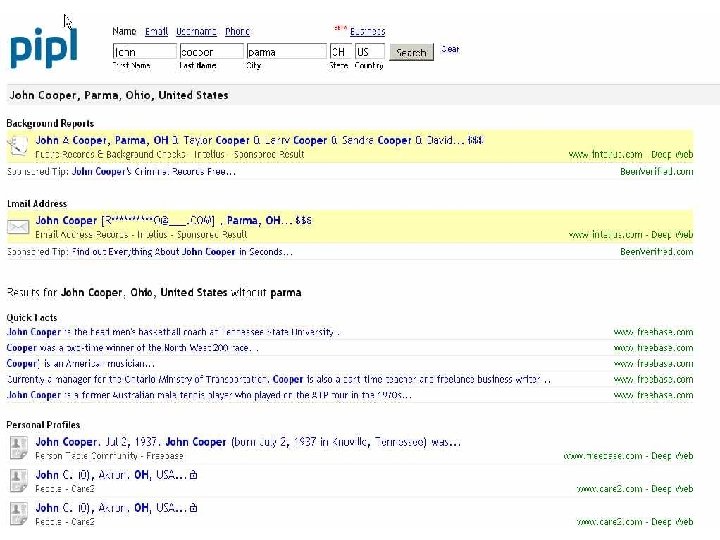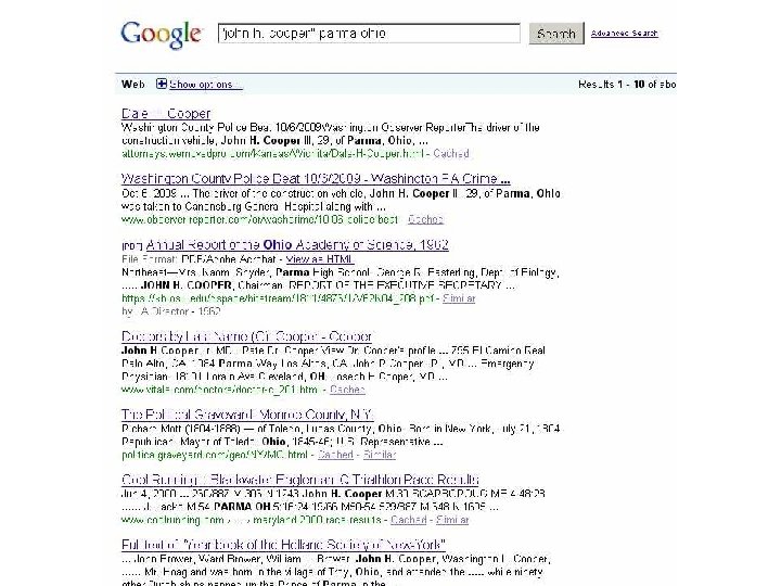 Accessing Invisible Web l l l Find databases via directories or search engines (search for a subject term and the word “database”), or ask a librarian. The Librarian’s Internet Index and Complete Planet. Bookmark the databases you find See Web Searching Guide Example – A person's traffic tickets. Try a search on Google, then try a search on pipl. com