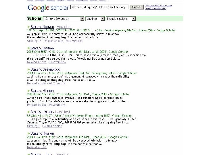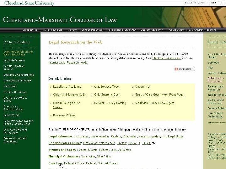 Internet v. Lexis/WL Benefits of Lexis, WL, others (Casemaker): l Coverage. Internet, Ohio cases back to 1950, mid 90 s for unreporteds l Better Search Mechanisms l Editorial features – headnotes, annotations l Secondary sources – treatises, practice books l Aggregate Info for one stop searching l Trustworthiness