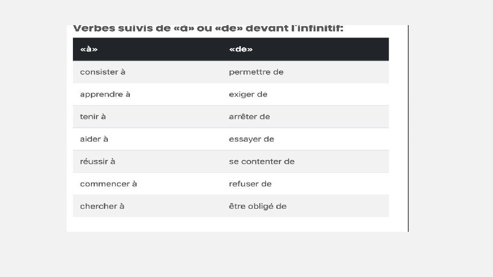 POINT GRAMMAIRE • Les prépositions «à» et «de» en français sont le plus souvent suivies d’un verbe à l’infinitif. Certains verbes sont suivis immédiatement de l’infinitif (verbes de mouvement: aller, sortir, partir, monter, descendre; verbes d’opinion et préférence: aimer, détester, aimer mieux; verbes de volonté: vouloir, espérer, désirer; verbes de nécessité: devoir, il faut, il vaut mieux).