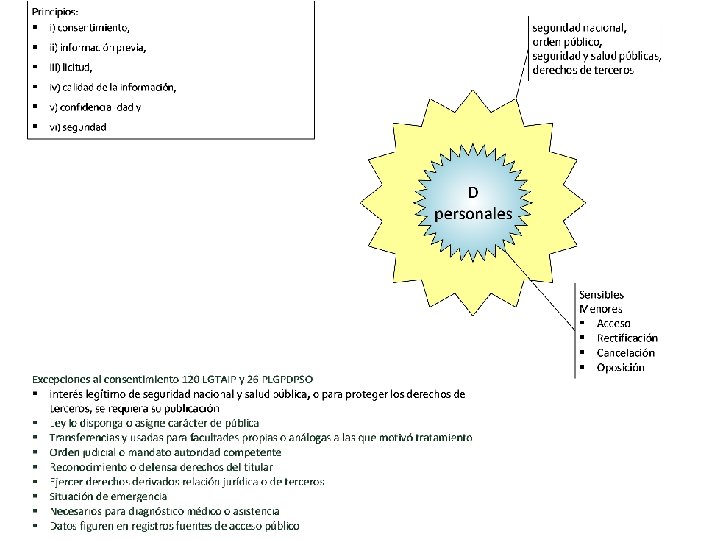 Límites Datos personales LGPDP • Artículo 4. - Los principios y derechos previstos en esta Ley, tendrán como límite en cuanto a su observancia y ejercicio, la protección de: • la seguridad nacional, • el orden, • la seguridad y la salud públicos, así como • los derechos de terceros.
