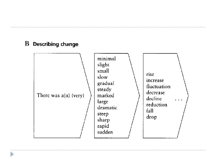 Describing change There was a minimal/slight/small/slow/gradual/steady/marked/larg e/ dramatic/sharp/rapid/sudden (rise, fluctuation, decrease, decline, reduction, fall, drop)