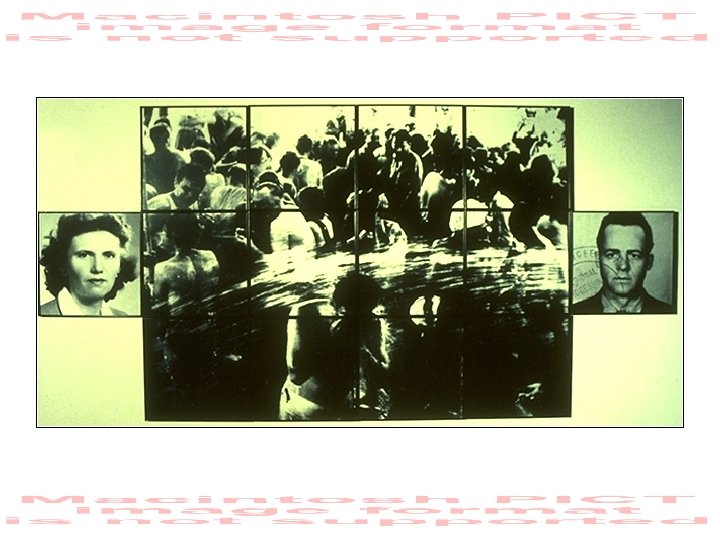 “Arrival” screenprint, photographs, 1991. • The central image is based on one of the artist’s father’s photographs of • • • what appears to be a de-lousing at the Bonegilla migrant reception centre during the period 1947 -49. On either side are passport photographs of his parents. The insensitivities of those dealing with newcomers in their treatment is a recurring theme in Milan Milojevic’s Arrival series. (Collection of the artist)