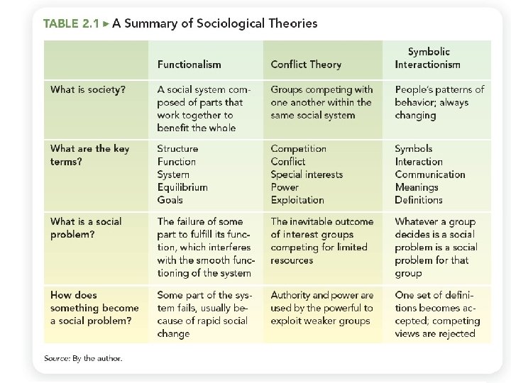 The Three Theories FUNCTIONALISM A social system composed of parts that work together to benefit the whole CONFLICT THEORY Groups competing with one another within the same social system SYMBOLIC INTERACTIONISM People’s patterns of behavior always changing, and people give meaning to behaviors