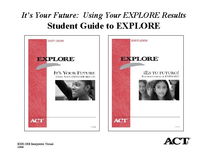 Why Take EXPLORE? § EXPLORE shows your academic strengths and weaknesses in English, math, reading, and science § EXPLORE helps you search for careers and learn which ones might be right for you § EXPLORE helps you choose high school courses that will prepare you for college and work EXPLORE Interpretive Visuals 2/2008