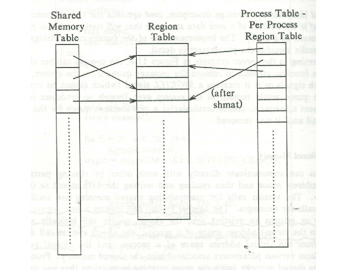 Shared Memory in System V (cont. ) • shmget create a new region of shared memory or returns an existing one – shmid = shmget (key, size, flag) • shmat logically attacheds a shared memory to the virtual address space of a process – virtaddr = shmat (id, addr, flags) • shmdt detaches a shared memory from the virtual address – shmdt(addr) • shmctl manipulate various parameters associated with the shared memory – shmctl(id, cmd, shmstatbuf)