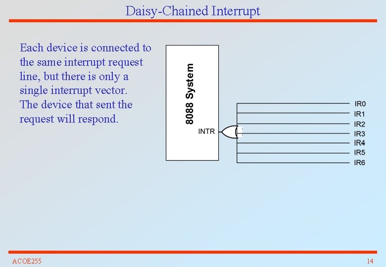 Daisy-Chained Interrupt Each device is connected to the same interrupt request line, but there is only a single interrupt vector. The device that sent the request will respond. ACOE 255 14