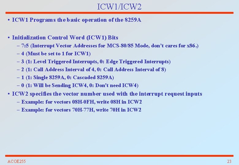 Programming the 8259 A • Initialization Control Words (ICWs) – – Prgrammed before 8259 A begins to function A 0 must be high There are four ICWs: ICW 1, ICW 2, ICW 3, ICW 4 When there is only one 2259 A in the system, ICW 3 is not necessary • Operation Control Words (OCWs) – Programmed during normal operation – There are three OCWs: OCW 1, OCW 2, OCW 3 – A 0 must be low, except in OCW 1 ACOE 255 22