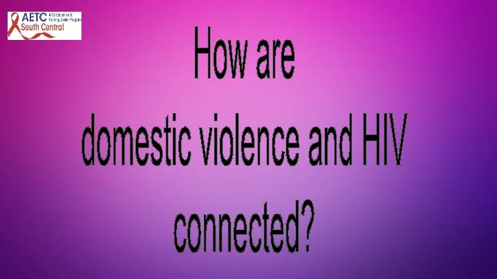 Domestic Violence & Risk of Contracting HIV ★ Abusive partners may force victims to engage in sexual activities with others. ★ Victims of domestic violence often suffer a wide range of health-related problems caused or exacerbated by the abuse. This negative effect on their health may compromise their immune system in ways that increase their risk of HIV. ★ Abusers may prevent victims from receiving medical care which may, in turn, negatively impact their health and increase their risk of contracting HIV. (New York State, 2020)
