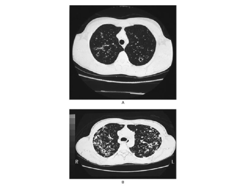 Chest Radiography a. Symmetrical micronodular and Interstitial infiltration predominantly in the middle and upper lobes b. Increased lung volumes c. Rare: alveolar infiltrates, hilar LAD, pleural effusion