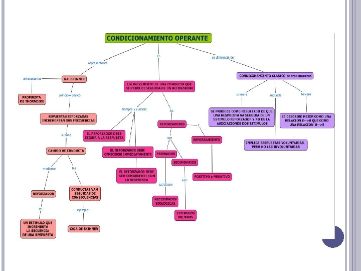CONDICIONAMIENTO OPERANTE O INSTRUMENTAL La presentación del estímulo (refuerzo-castigo) depende de la respuesta que emita el sujeto THORNDIKE: aprendizaje e-r Ley del efecto: si una respuesta en presencia de un estímulo es seguida por un acontecimiento satisfactorio, se fortalece la asociación entre el e y la r, mientras que si a la respuesta le sigue una consecuencia desagradable, la asociación se debilita SKINNER: operante libre