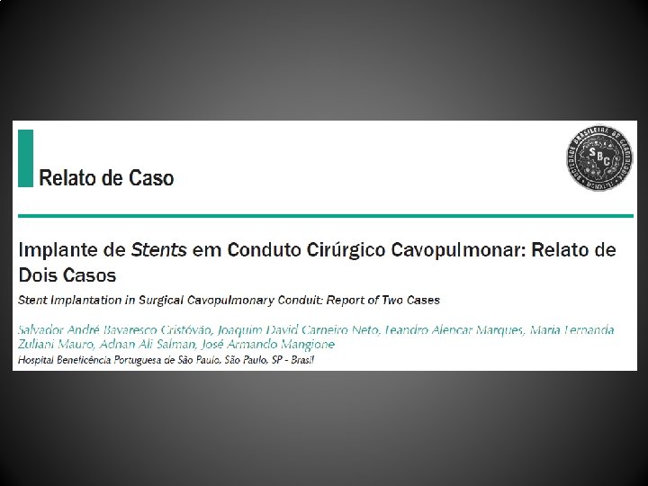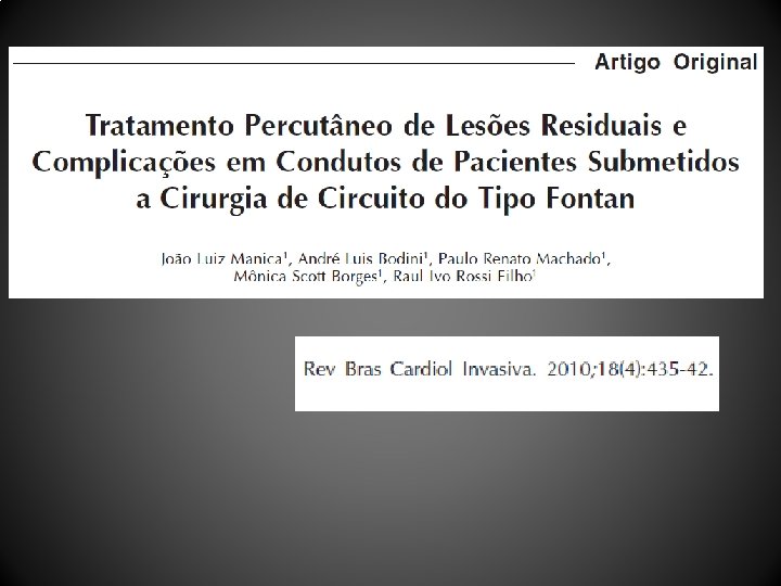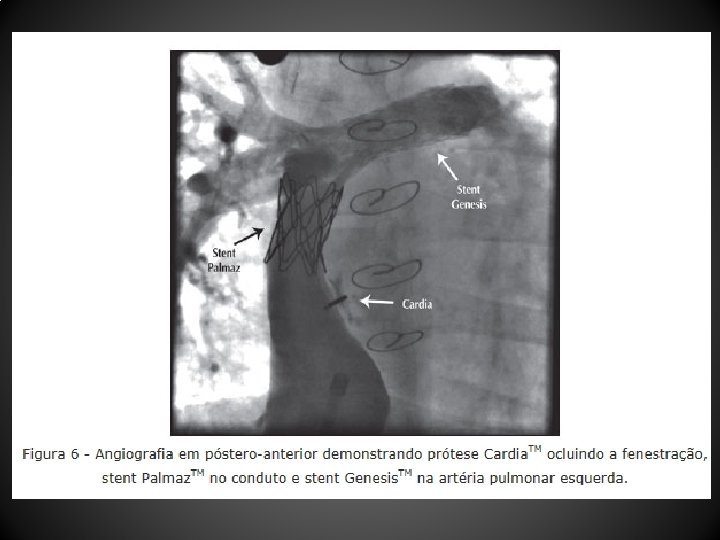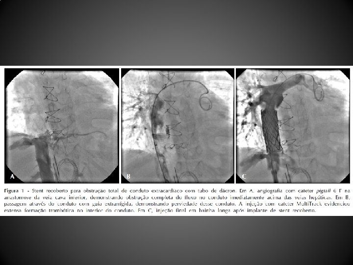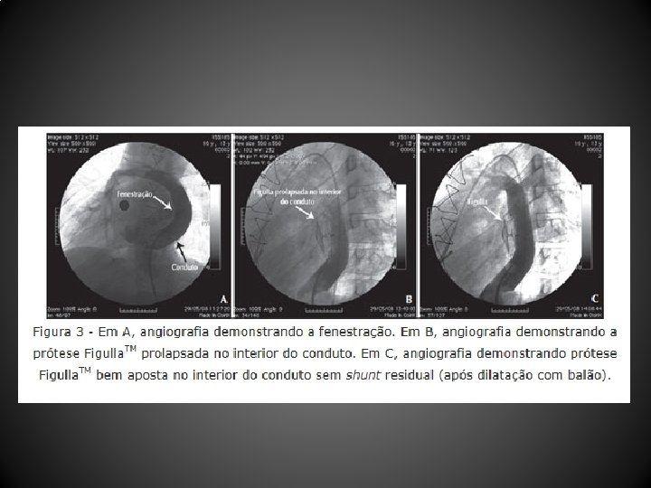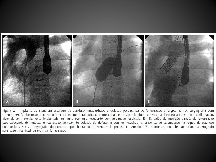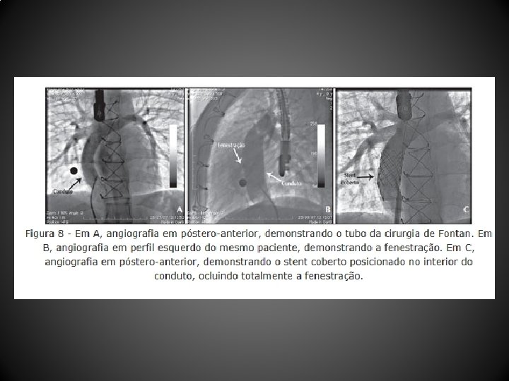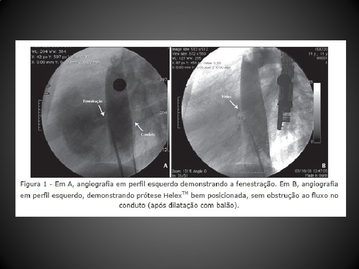 Conclusão • O tratamento da obstrução de condutos por meio do implante de stents não-recobertos e a oclusão de fenestrações cirúrgicas com stents recobertos ou dispositivos de Amplatzer são procedimentos seguros, com altos índices de sucesso imediato e que se mantêm a médio prazo