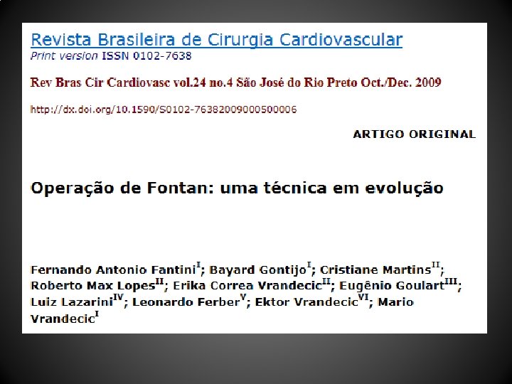 Conclusão • Resultados imediatos obtidos com a anastomose cavopulmonar total pela técnica do conduto intracardíaco foram superiores quando comparada às técnicas clássicas de túnel lateral e conduto externo