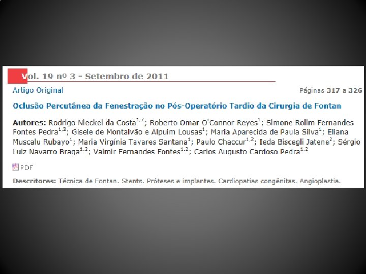 Conclusão • A oclusão percutânea da fenestração no pósoperatório tardio da cirurgia de Fontan pode ser realizada de maneira segura e efetiva com ampla variedade de técnicas e dispositivos, resultando na (quase) normalização dos níveis de saturação arterial • Acredita-se que esse tipo de procedimento deva ser realizado após teste de oclusão temporário, em centros com experiência na utilização de dispositivos para fechamento de defeitos septais e com auxílio do ecocardiograma transesofágico