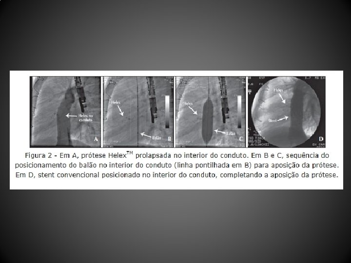 Procedimento e técnica • Implante de stents em condutos • Acesso femoral obtido em 6 pacientes e acesso jugular em 2 pacientes por obstrução venosa femoral crônica • Após criterioso estudo manométrico e anatômico, bainha longa introduzida através do conduto sobre guia extrarrígida e avanço do stent montado manualmente em balão com diâmetro previamente escolhido e insuflado para desobstrução do conduto e/ou oclusão de fenestração, no caso de stents recobertos • Todos os pacientes receberam heparina (100 UI/kg) e profilaxia com antibióticos endovenosos