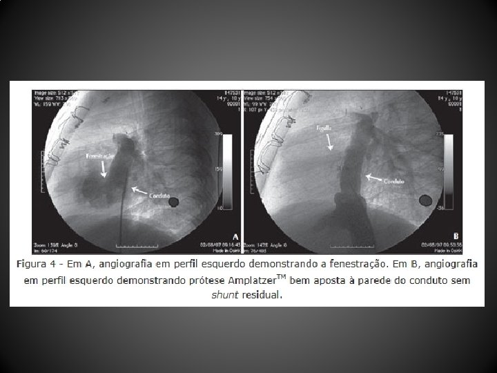Procedimento e técnica • Após cruzar a fenestração, guia extrarrígida posicionada nas veias pulmonares ou na cavidade atrial, através da qual balão de medição insuflado para teste de oclusão da fenestração com monitorização de saturação arterial de oxigênio bem como de pressão arterial sistêmica e de enchimento • Na ausência de aumento significativo da pressão venosa sistêmica, queda da saturação de oxigênio ou sinais de baixo débito cardíaco, deu-se prosseguimento à oclusão da fenestração com prótese de Amplatzer