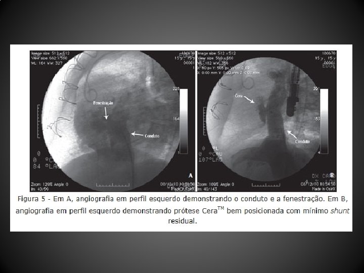 Indicação de oclusão da fenestração • Indicada na presença de cianose e dessaturação significativa (< 80 -85%) em condições basais, com piora no exercício, acompanhada de hemoconcentração e sintomas de fadiga e dispnéia ou evidências de embolia paradoxal prévia (acidentes vasculares ou abscessos cerebrais)