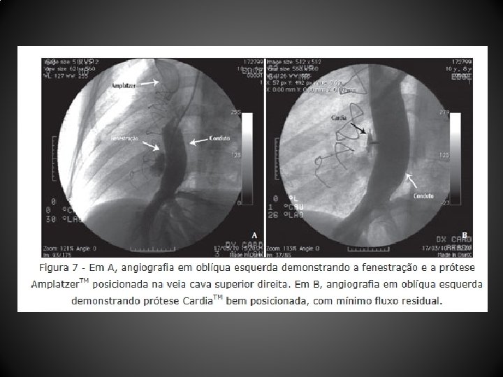 Resultados • Entre abril de 2004 e dezembro de 2010, 12 pacientes (média de idade, 103, 1 + 88, 6 meses; peso, 29, 9 + 12, 7 kg) submetidos a CF (10 tubos extracardíacos, 2 túneis intra-atriais) foram tratados 44, 1 + 26, 7 meses após a CF • Um paciente não tolerou o teste de oclusão com o balão, sendo contraindicado o procedimento • As próteses utilizadas foram: Helex. TM (4 pacientes), Amplatzer. TM (2 pacientes), Cardia Atriasept. TM (2 pacientes), Figulla. TM (1 paciente), Cera. TM (1 paciente), e 1 stent coberto Cheatham-Platinum. TM • Após a oclusão da fenestração, a saturação de oxigênio aumentou significativamente (82, 1 + 6, 5% para 95, 2 + 3, 2%), sem aumento significativo da pressão venosa central (12, 4 + 2, 6 mm. Hg para 14, 5 + 2, 3 mm. Hg) nem queda do débito cardíaco • Após o procedimento foi observado shunt residual imediato em 5 pacientes, que desapareceu antes da alta