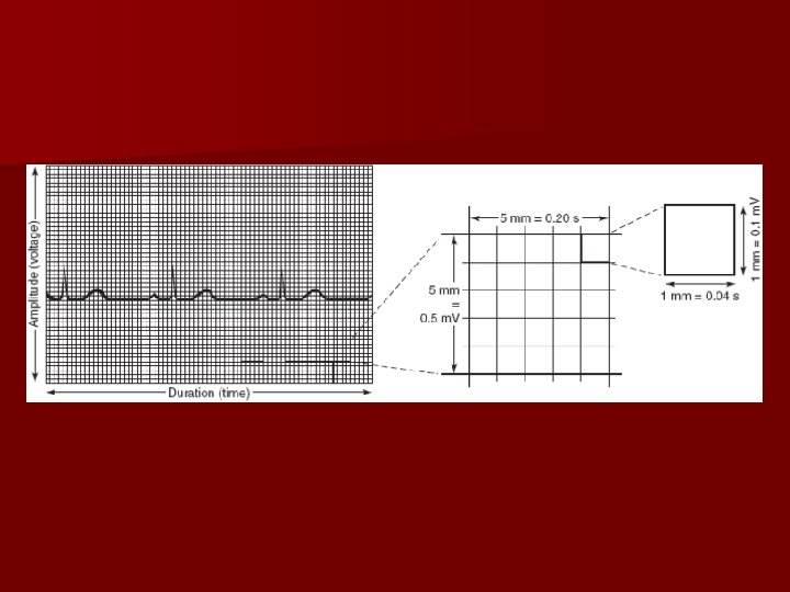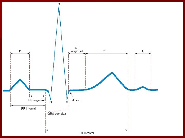 Electrocardiographic Complexes, Segments, and Intervals n n n n n P wave PR segment PR interval it normally measures from 0. 12 to 0. 20 second QRS complex QRS duration it normally measures from 0. 04 to 0. 10 second ST segment it is normally not elevated more than 1 mm or depressed more than 0. 5 mm from the isoelectric line. Its amplitude is measured at a point 1. 5 to 2 mm after the J point T wave U wave QT interval
