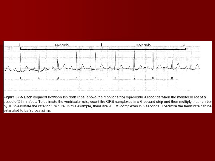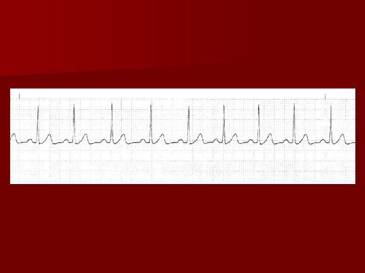 Normal Rhythms n Normal sinus rhythm is the rhythm originating from the sinoatrial (SA) node (dominant pacemaker) that meets the following electrocardiographic (ECG) criteria: – Rhythm: Atrial and ventricular rhythms regular – Rate: Atrial and ventricular rates of 60 to 100 beats/min – P waves: Present, consistent configuration, one P wave before each QRS complex – PR interval: 0. 12 to 0. 20 second and constant – QRS duration: 0. 04 to 0. 10 second and constant