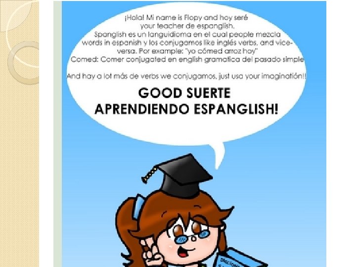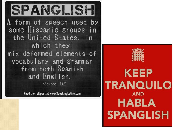 Evidence from Research and Principles from Linguistics Tell Us… Only fluent bilinguals truly code- switch. Spanglish is a rule-governed system that has great expressive potential and that is used by many fluent bilinguals for a complex set of reasons. Not all bilinguals (even very fluent bilinguals) can translate or interpret easily because this is a skill that has to be cultivated, and not an automatic part of bilingualism.