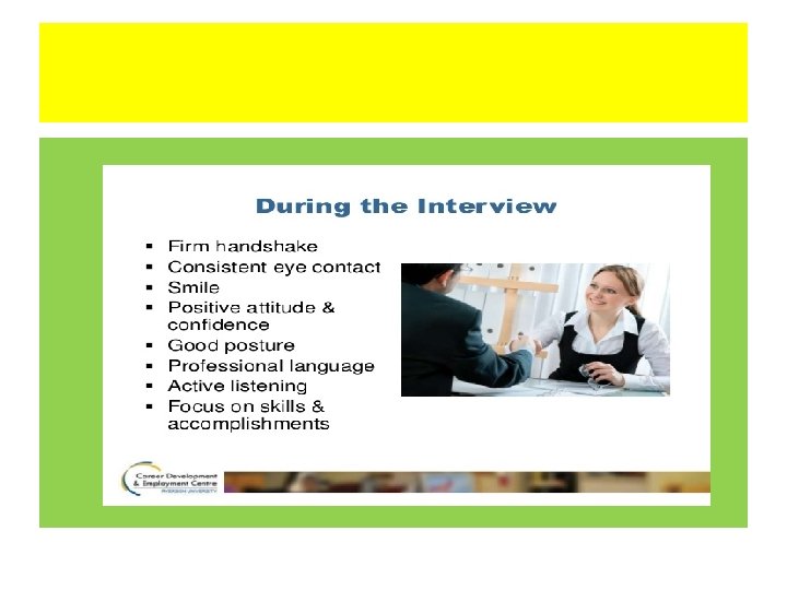 After the interview • Review your performance • Make plans to improve your skills • Make the interview a learning experience