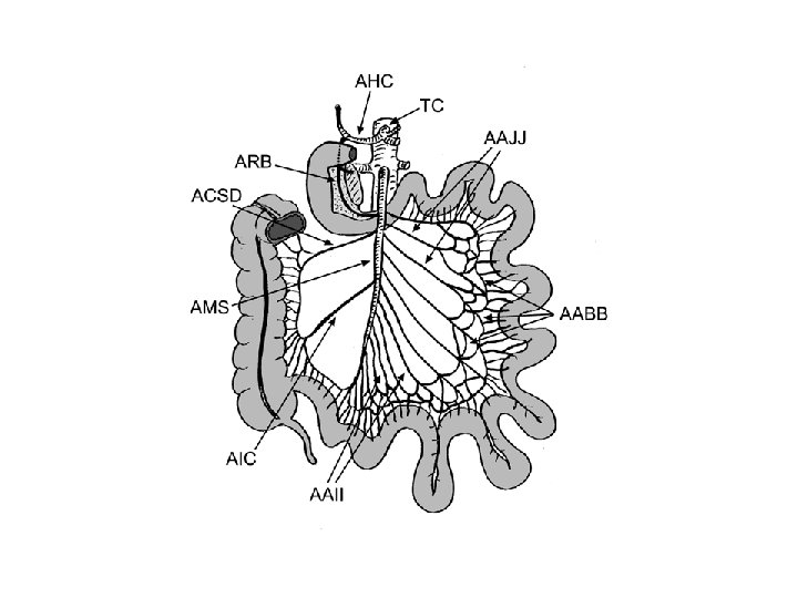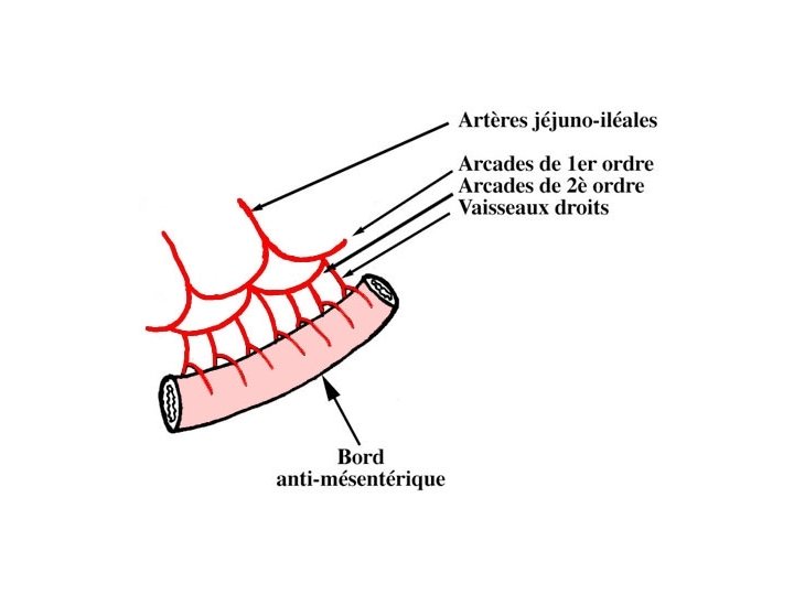 D - vascularisation Ø les artéres : se sont les artéres jéjunales et iléales ; branches de l » artére mésentérique supérieure. ü Au nombre de 12 à 15 naissantsq du bord gauche de l’artére et descendants dans le mésentère. ü Leurs anastomoses decrivent des arcades vasculaires de 1 er ; 2ème ; 3ème et 4ème ordre. ü Des arcades de 1 er ordre naissent perpendiculairement à l’intéstin les artéres droites.