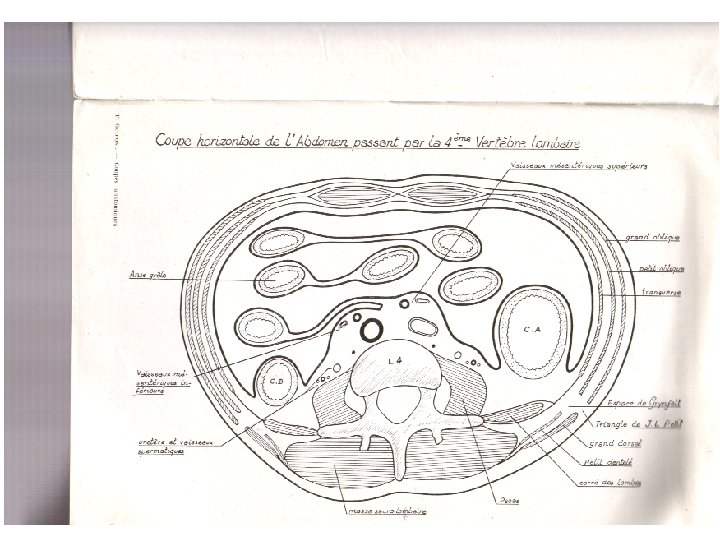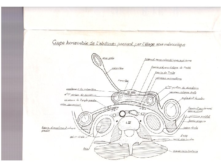 suite Ø La racine du mésentère est longue de 15 cm Ø Elle commence à gauche de L 2 Ø Elle descend obliquement à droite. Ø Elle se termine à droite de L 5. Ø Elle longe le bord droit de D 1 ; surcroise successivement le processus unciné du pancreas ; D 2 ; La veine cave inférieure ; l’uretère droit et les vaisseaux testiculaires ou ovariques droits.