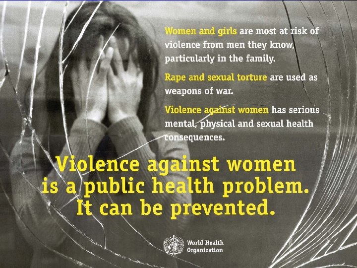 Intimate Partner Violence • Population-based telephone survey (N=8000 women) (Tjaden & Thoennes, 1998) • 25% of women reported lifetime physical and/or sexual assault by an intimate or ex-intimate partner • Estimated 4. 8 million women report physical/sexual violence from an intimate in the past year. § § 40% of assaults result in injuries 20% seek health care services related to the assault • 10% of Oregon women report physical/sexual violence from an intimate in the past year (Oregon DHHS).