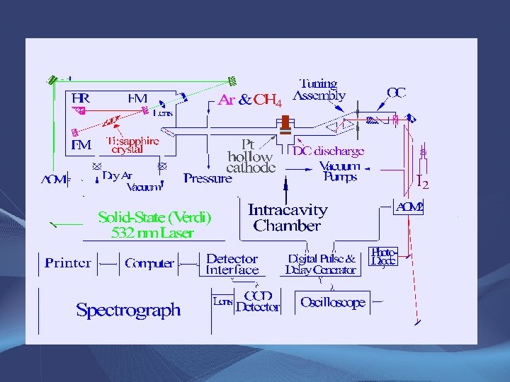 Experimental Method • Intracavity laser spectrometer at UM-St. Louis – Effective absorption pathlength is ~ 1 km – External iodine cell for calibration • Spectrum originally obtained with ~2 Torr mixture of Ar and H 2 – Still searching for Pt. H! • Pt-lined hollow cathode, 0. 2 -0. 8 A plasma current • Initially no CH 4 (or other carbon source) added! – We presume that carbon comes from residual methane absorbed on chamber surfaces – Adding CH 4 (3% in Ar) enhances signal