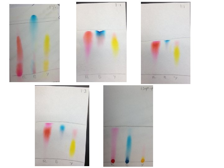 Retention/Retardation Factor • Rf = distance to center of spot distance solvent front (no units) • Rf values indicate if component is more attracted to mobile phase or stationary phase-How?