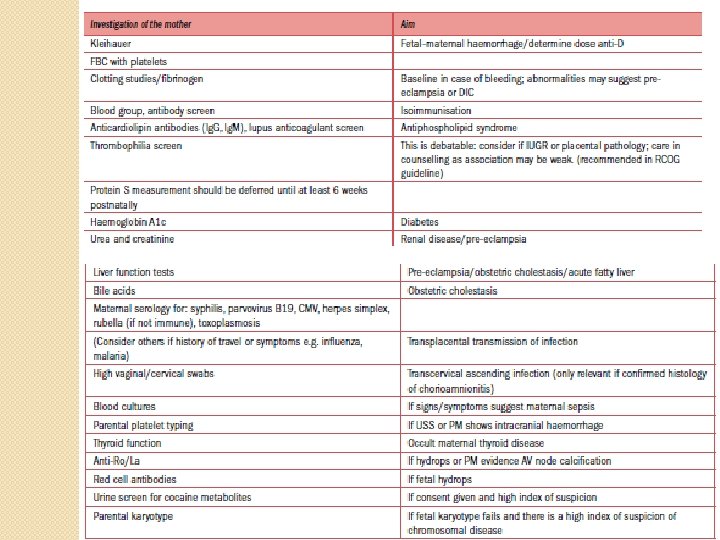 Causes of IUFD � Fetal ◦ ◦ ◦ Cord accidents (knots, thrombosis, strangulation and torsion) Feto–fetal transfusion Feto–maternal haemorrhage Chromosomal and genetic disease Structural abnormality Infection –bacterial, viral ( TORCH) ◦ Anaemias of fetal origin e. g. alpha-thalassaemia � Direct maternal effects ◦ Obstetric cholestasis ◦ diabetes ◦ Antibody production e. g. rhesus disease, platelet alloimmunisation, congenital heart block ◦ Hypertension ◦ Any disorder causing septicemia with hypoperfusion