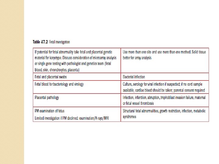 Investigation of the fetus Postmortem examination �written and verbal information ◦ aim of PM examination, ◦ the extent of the examination, ◦ how samples of tissue are dealt with afterwards ◦ whether samples are kept for research or audit. �They also need to know how long the process will take and whethere will be any delay in releasing the baby for burial or cremation.