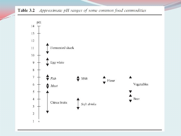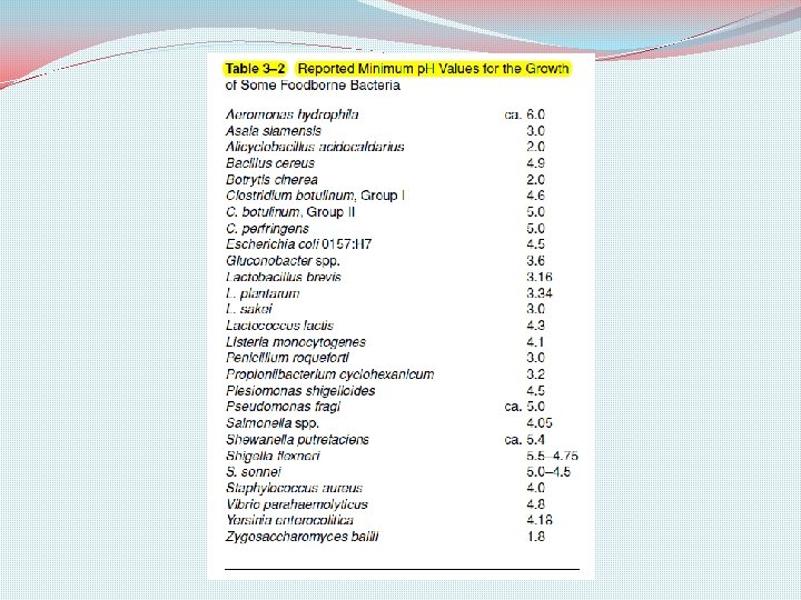 �Vegetables are generally low in proteins and, consequently, lack the buffering capacity to resist changes in their p. H during the growth of microorganisms �Although acidic p. H values are of greater use in inhibiting microorganisms, alkaline values in the range of p. H 12– 13 are known to be destructive, at least to some bacteria. �For example, the use of Ca. OH 2 to produce p. H values in this range has been shown to be destructive to Listeria monocytogenes and other foodborne pathogens.