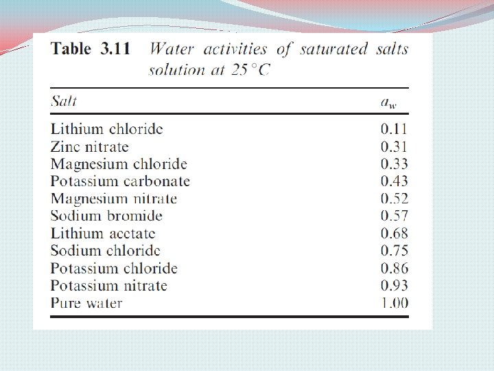 q. When salt is employed to control aw, an extremely high level is necessary to achieve aw values below 0. 80. q. Pure water has an aw of 1. 00 q 22% Na. Cl solution (w/v) has an aw of 0. 86 q Saturated solution of Na. Cl has an aw of 0. 75.