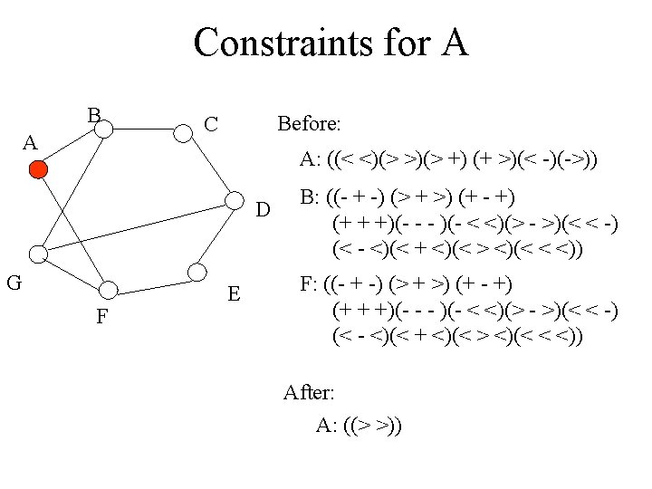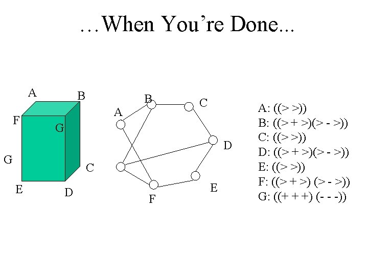 Simplest Example (trihedral) B A F B C A G D C E D G E F A: ((< <) (> >) (> +) (+ <) (> -)(- <)) 6 Ls F: ((-+-)…. (+++)…(<-<). . . ) 3 Arrows, 4 Forks, 4 Ts