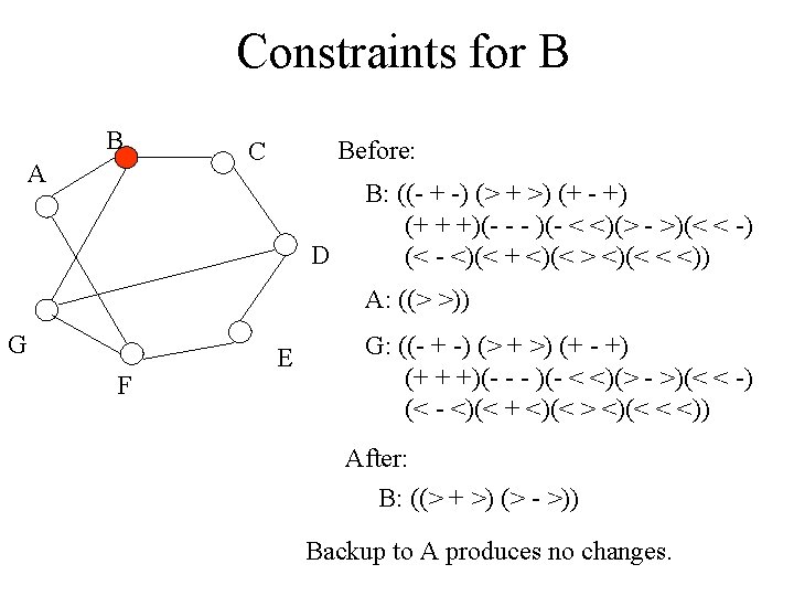 CS & Graphs: Operations • Constraints are propagated along edges that relate dependent objects, generally until each feature is assigned a single value. • Search may be required to propagate hypothetical constraints (guesses at values); these constraints will need to be undone when they lead to inconsistencies (the inability to assign some other feature a value given the guess).