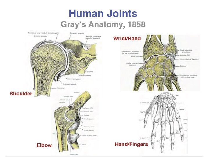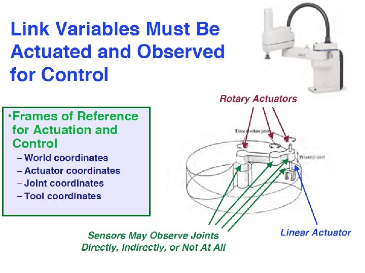 DOF for animals • A human arm has 7 DOF: – 3 in the shoulder, – 1 in the elbow, – 3 in the wrist • All of which can be controlled. • A free object in 3 D space (e. g. , the hand, the finger tip) can have at most 6 DOF! • So there are redundant ways of putting the hand at a particular position in 3 D space. • This is the core of why robot manipulation is very hard! One minute test!