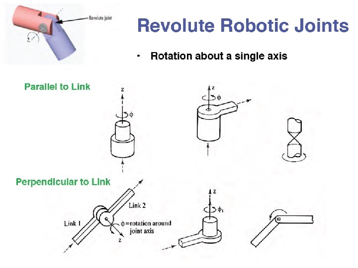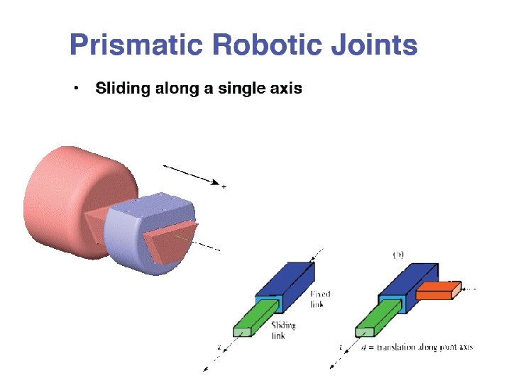 Joints. • Joints connect parts of manipulators. • The most common joint types are: • Prismatic Link – revolute link (rotation around a fixed axis) – prismatic link (linear movement) These joints provide the DOF for an effector.