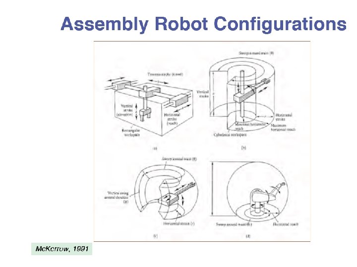 Manipulators: Robot Specifications – Number of Axes • Major axes, (1 -3) => Position the wrist • Minor axes, (4 -6) => Orient the tool • Redundant, (7 -n) => reaching around obstacles, avoiding undesirable configuration – – Degree of Freedom (DOF) Workspace Payload (load capacity) Precision v. s. Repeatability Which one is more important?