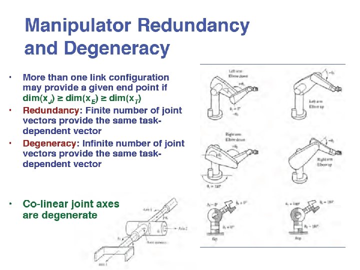 • • Terms for manipulation Links and joints End effector, tool Accuracy vs. Repeatability Workspace Reachability Manipulability Redundancy Configuration Space