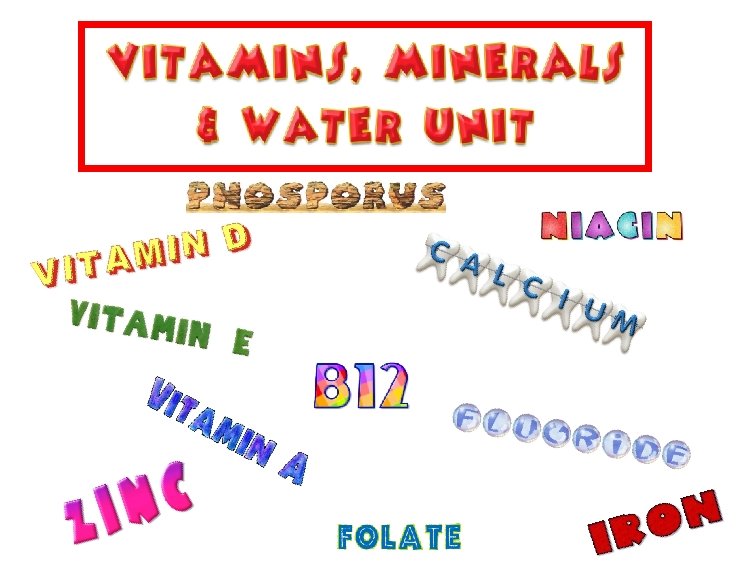 Intro to Vitamins, Minerals & Water 1. What is the main function of vitamins and minerals? To regulate body functions 2. What foods are a lot of the vitamins and minerals we need found in? Fruits and Vegetables 3. Because different fruits and vegetables have different vitamins and minerals, how can we ensure that we get all the different vitamins and minerals that we need? Eat a variety of fruits and vegetables