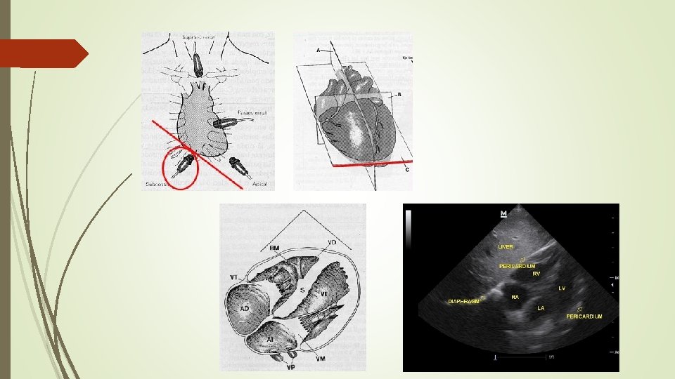 4. - SUBCOSTAL Visualizar el corazón desde el hipocondrio derecho/epigastrio utilizando el hígado como ventana acústica. Plano TRANSVERSAL, hipocondrio derecho/Epigastrio, angulación cefálica del transductor. DERECHA IZQUIERDA