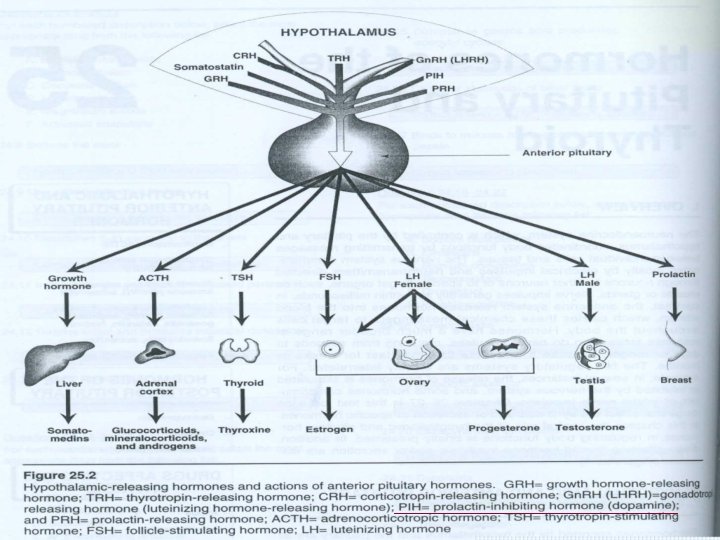 Bajo control hipotalámico por factores liberadores ü (+) Tirotropina (TRF) ü (+) Luteinizante (LHRF) ü (-) Somatotropina: modula liberación de hormona de crecimiento. ¡¡Cerebro actúa como glándula¡¡
