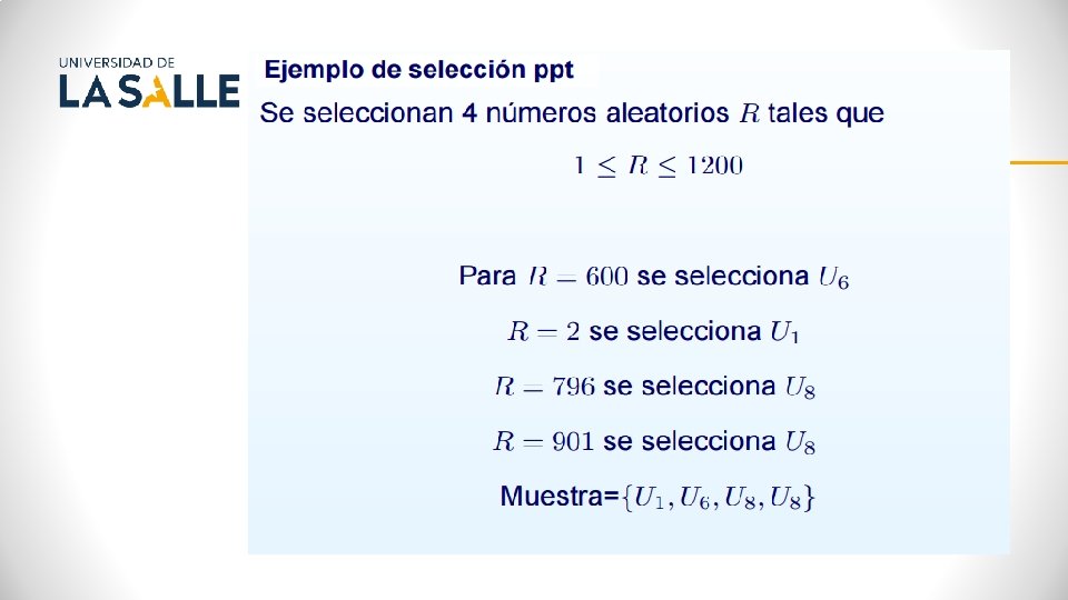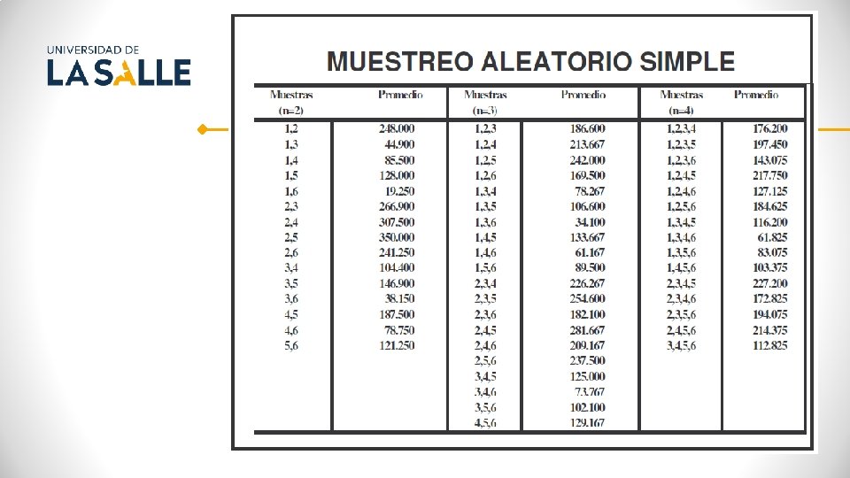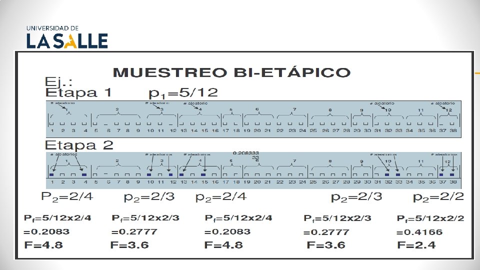 TÉCNICAS DE MUESTREO Cuando elegimos individuo de una población de estudio para formar muestras podemos encontrarnos en las siguientes situaciones: 1) Se puede definir el conjunto de todas las posibles muestras que se obtengan con un proceso de selección escogido. 2) A cada muestra posible le pertenece una probabilidad de selección P(S) conocida. 3) Todo elemento de la población debe tener una probabilidad mayor a cero de ser seleccionado, lo cual debe ser garantizado por el proceso de selección. 4) El proceso de selección que se utilice debe ser un mecanismo aleatorio que garantice que cada muestra posible s recibe exactamente la probabilidad p(s) de ser seleccionada. Muestreos probabilistas